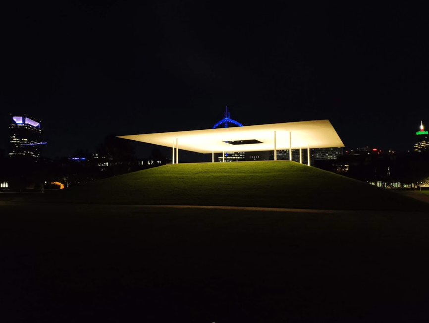 The night we arrived in Houston, we drove to Rice University and visited their Twilight Epiphany structure. It was already fully dark by the time we got there, so we missed the hour when it was optimal for viewing and the light show that went with the sunset. Nonetheless, it was still extremely beautiful, with its beige roof projecting a calm light gradient on the well kept grass slope below. The structure was in the middle of a large open patch of grass, which allowed for an unobstructed view when standing at any angle. The several tall buildings that are a part of the Hermann medical center further away in the background juxtaposed with Twilight Epiphany demonstrated the calm in the activeness of Houston that we would come to love.