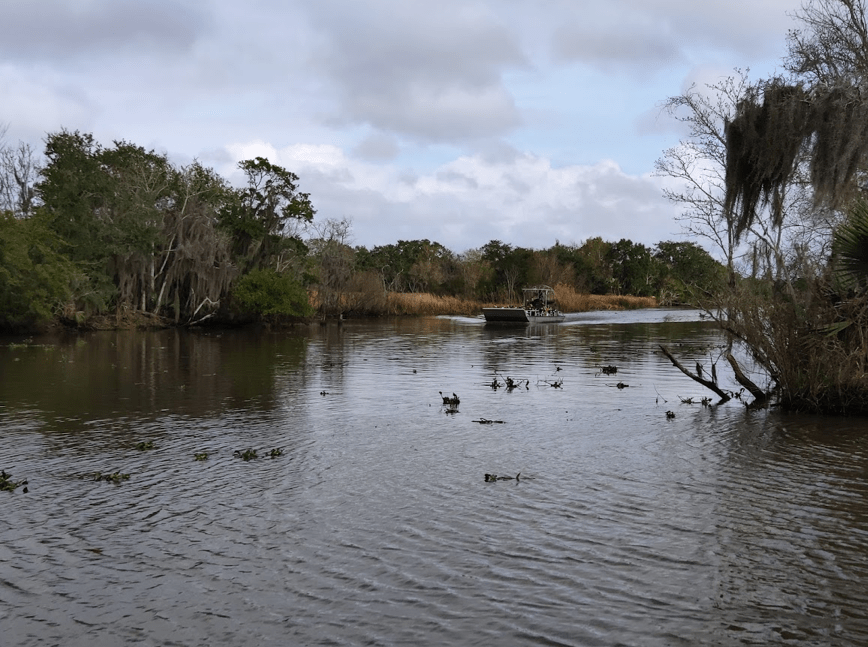 Afterwards, we got on the flat boat and made our way out to the swamp, where we got to experience up close the vegetation and wildlife of the expansive bayou. The best part about the swamp tour was the boat ride which, unfortunately was not the main reason why we paid to go. We’d hoped to see a lot of wildlife native to that area, especially alligators, turtles, and snakes up close. Unfortunately, we only saw one alligator resting by the side of the water with its head arched upwards. Like the albino alligator in the store, it also made no movement…