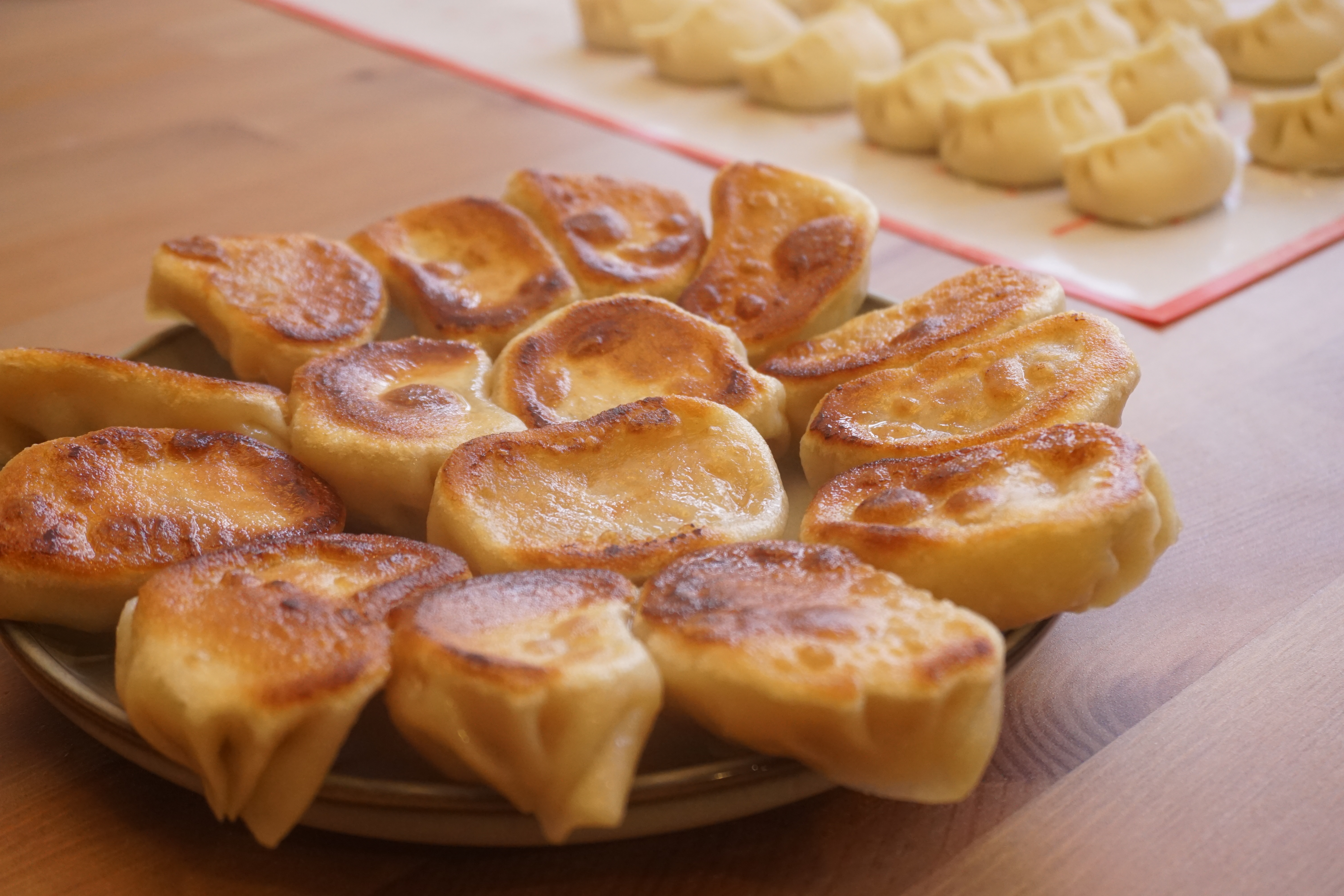 - When dumplings are cooked, place a plate over the pan and flip it over.